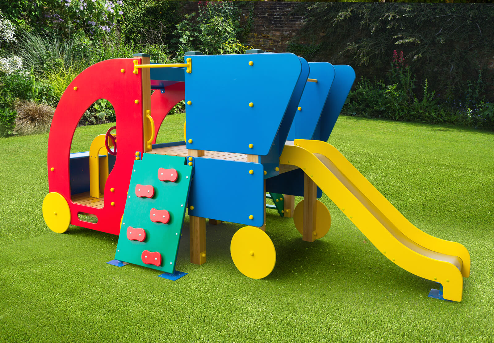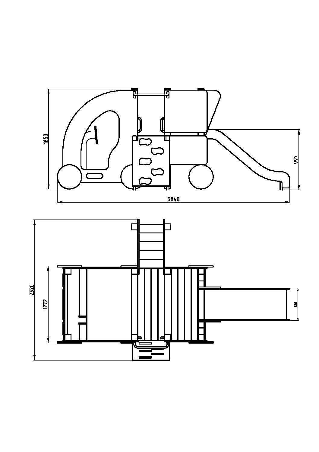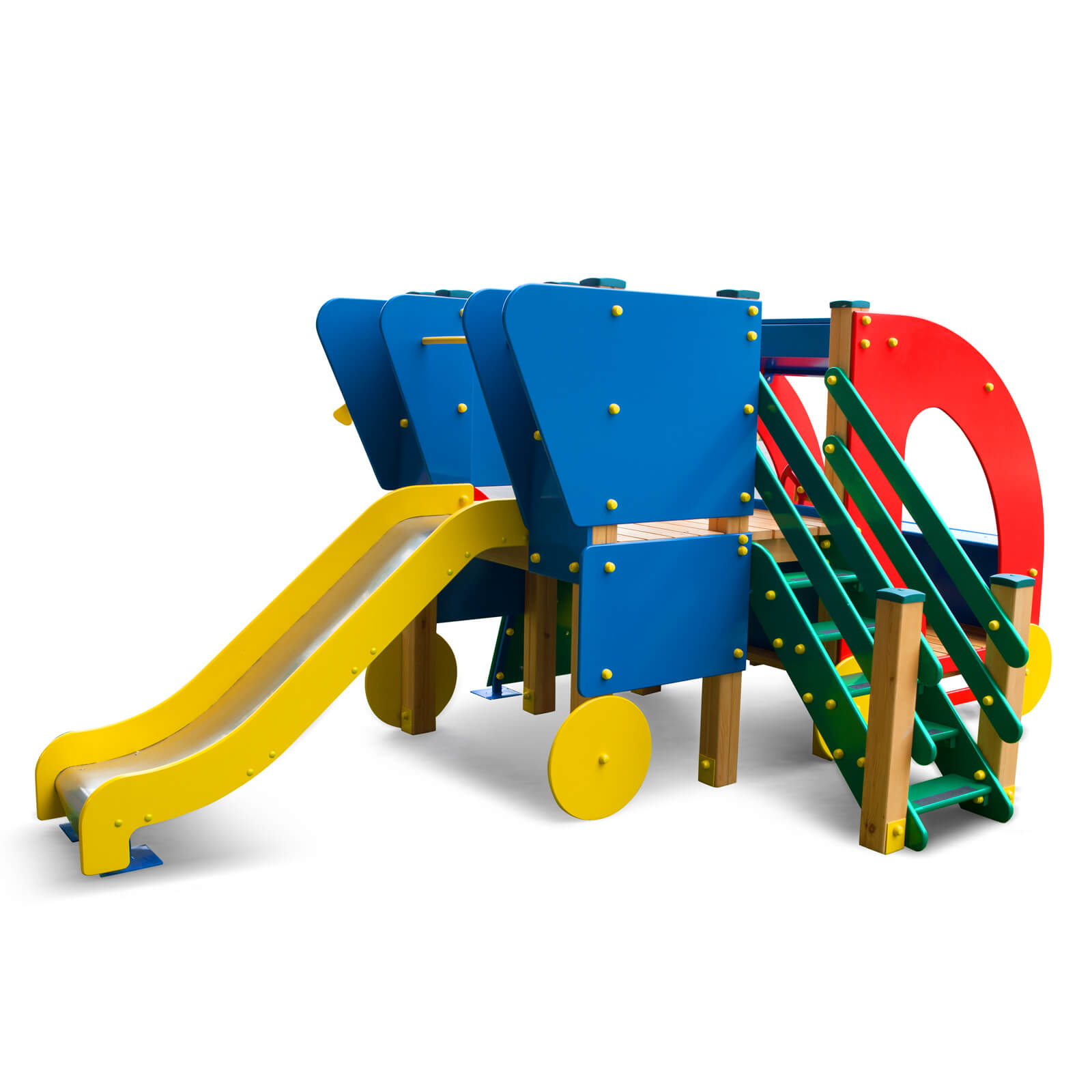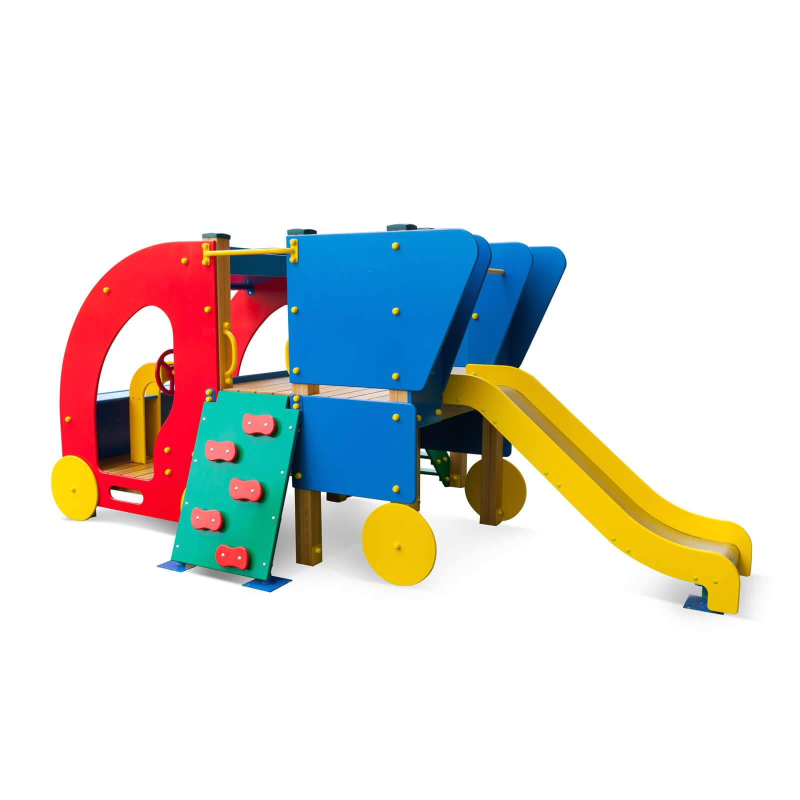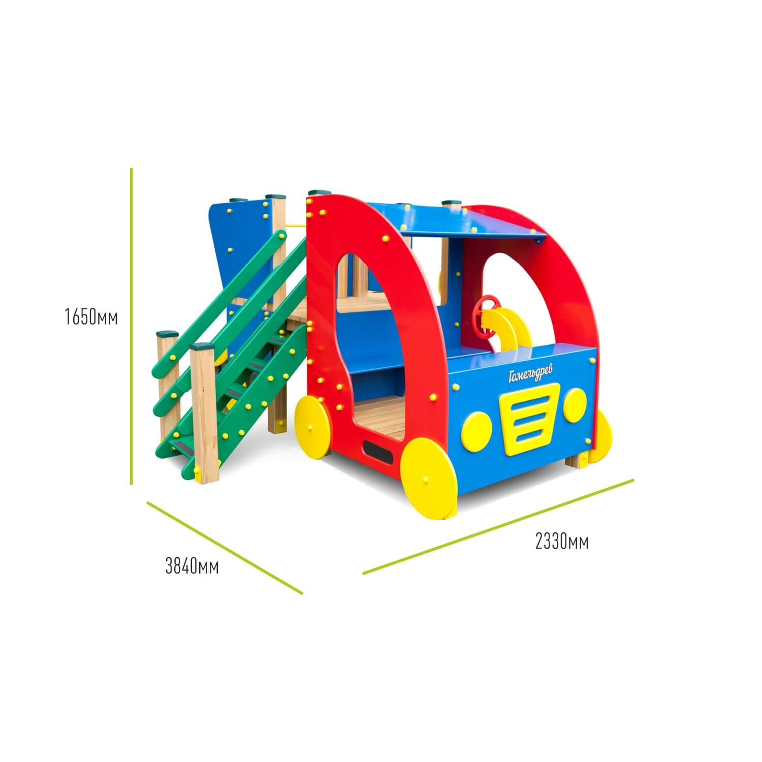 Детский игровой комплекс состоит из следующих частей: кабина машинки и площадки открытой. Внутри кабины расположена скамейка и руль в сборе. К площадке с трех сторон примыкают: лестница, горка и скалодром. Открытая площадка имеет ограждение. Все резьбовые соединения закрыты пластиковыми заглушками. Части прочно соединены между собой, конструкция выполнена в соответствие с действующими ГОСТами, нормами и расчетами.