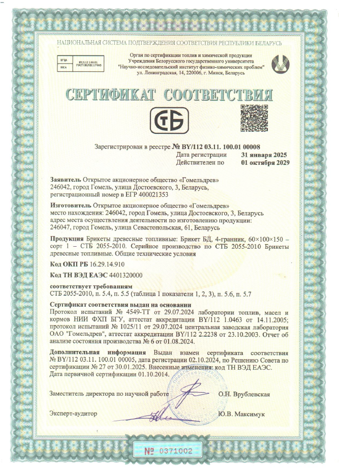Сертификат СТБ (брикеты) Гомельдрев