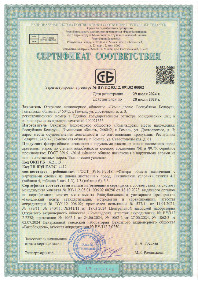 Сертификат фанера на ГОСТ3916.1-2018